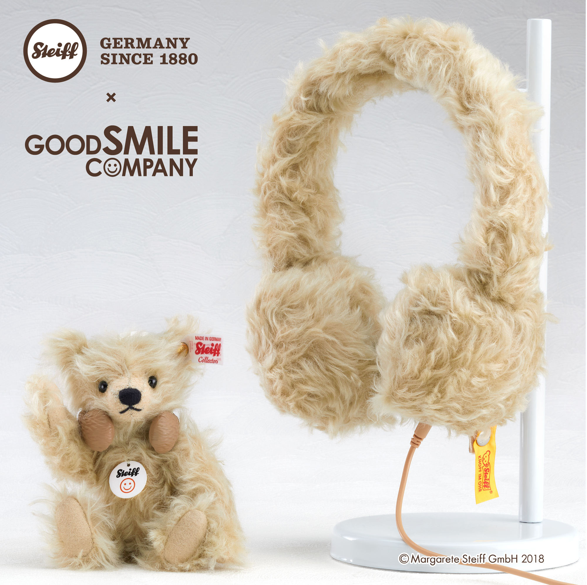 Good Smile Company is pleased to announce these Steiff Teddy Bear Mohair Headphones. The product will be on sale from the 1st October 2018. The mohair featured on the on the headphones is the same soft, high quality blond mohair as is used for “Teddy Bear Luca” from Steiff’s popular series of Teddy Bears. A large-diameter 40mm dynamic driver unit is featured inside the headphones, providing balanced and high-quality audio across a wide range.